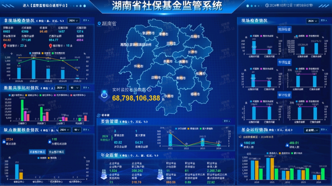 通过“驾驶仓”智慧大屏,运用数据可视化手段,湖南省实时监控全省社保业务数据,包括全省非现场检查、现场检查、社保数据共享比对、疑点数据核查情况、基金运行、要情管理、年金监督等内容。