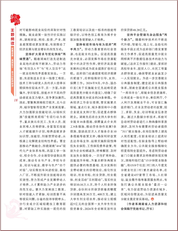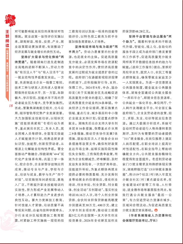 坚持有效市场与有为政府“两手用力”。劳动力是重要的社会资源,也是就业的主体。促进高质量充分就业,必须发挥市场在资源配置中的决定性作用,使经济高质量发展的过程成为就业提质扩容的过程。政府部门在遵循客观经济规律的前提下,应积极做好引导、支持、保障工作。2024年9月,中办、国办印发《关于实施就业优先战略促进高质量充分就业的意见》,明确了促进高质量充分就业的24条举措。中央经济工作会议强调,要实施重点领域、重点行业、城乡基层和中小微企业就业支持计划,促进重点群体就业。湖南先后出台支持大学生创业就业16条措施、保障重点企业用工9条措施、推动劳务协作发展7条措施、鼓励高层次人才服务企业10条措施等政策文件,确保利好政策直达市场主体;延续实施阶段性降低失业保险、工伤保险费率政策,有效为企业松绑减负、纾难解困;及时发放失业保险金、一次性扩岗补助、技能提升补贴,为重点群体再就业提供必要的物质基础;充分发挥创业带动就业的倍增效应,强化创业培训、创业补贴、创业贷款、创业载体、创业活动“五创联动”,落实创业培训10.16万人次,将个人创业担保贷款、合伙创业担保贷款最高额度分别提高至30万元、400万元,建立大学生创业项目库,推动设立规模超5亿元的全国第一支大学生创业投资基金,2024年全省新发放创业担保贷款48.28亿元。