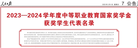 2025年5月4日,《人民日报》专版刊登了2023-2024学年中等职业教育国家奖学金100名获奖学生优秀代表,其中,包括全国技工院校类获奖者十名,我省经过严格选拔、评审、推荐的湖南工业技师学院周杨同学事迹脱颖而出,作为十名代表之一登上《人民日报》。