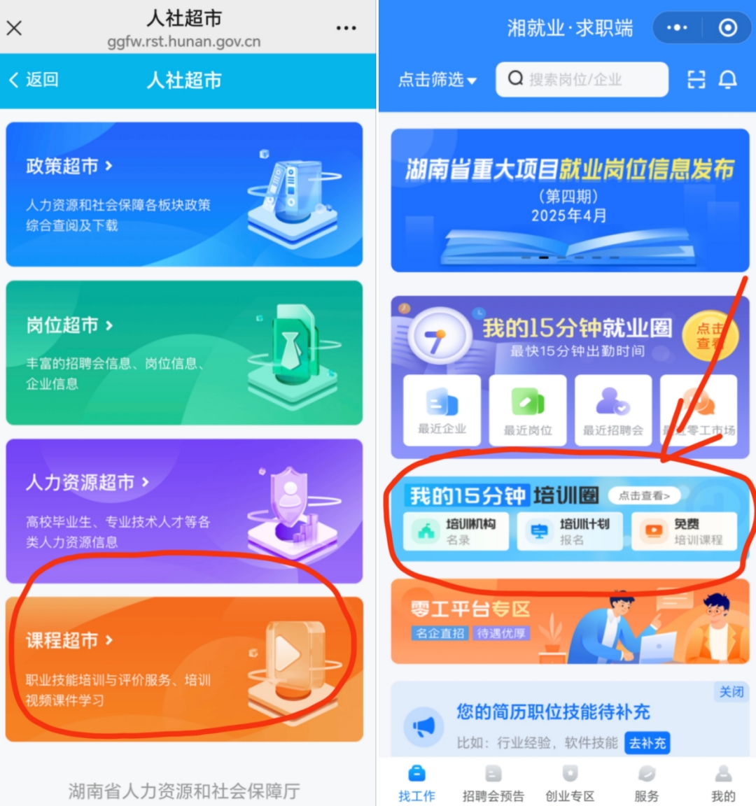 在“湖南人社”公众号打造“课程超市”,提供“培训、考证、就业”掌上一站式联动服务。2025年,积极响应国家“技能照亮前程”培训行动,服务再升级,依托“湘就业小程序”上线“我的15分钟培训圈”职业培训服务专区。
