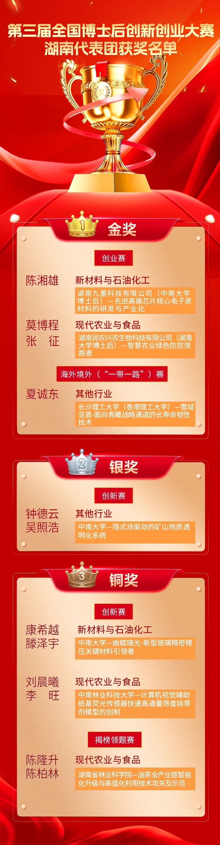 评委现场打分,分数瞬间显现,排名实时变化……10月28日,第三届全国博士后创新创业大赛经过扣人心弦的3天比拼,湖南代表团迎来喜人结果:荣获3个金奖、1个银奖、3个铜奖,金奖数和获奖数实现历史性突破。