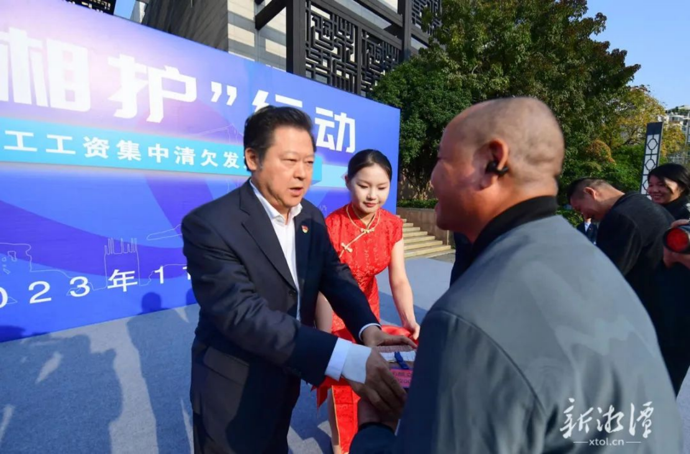 仪式上,湘潭市人社局介绍了全市根治欠薪工作开展情况。去年以来,在市委、市政府的坚强领导下,全市共处理工程建设领域各类欠薪投诉举报案件和欠薪隐患2856起,处置国省欠薪反映平台交办线索3791条,立案查处欠薪违法行为83起,累计为1.7万名农民工追发工资2.6亿元。2022年,全市根治拖欠农民工工资工作获得省政府真抓实干督查激励表彰。在近两年省对市州专项考核中,湘潭市获评A类市州。今年11月13日,全市农民工工资保障工作专题调度会召开后,市人社局、市住建局、市公安局、市信访局等部门联动出击,短时间内成功为132位农民工朋友追回被拖欠近两年的工资,总额达379.64万元。