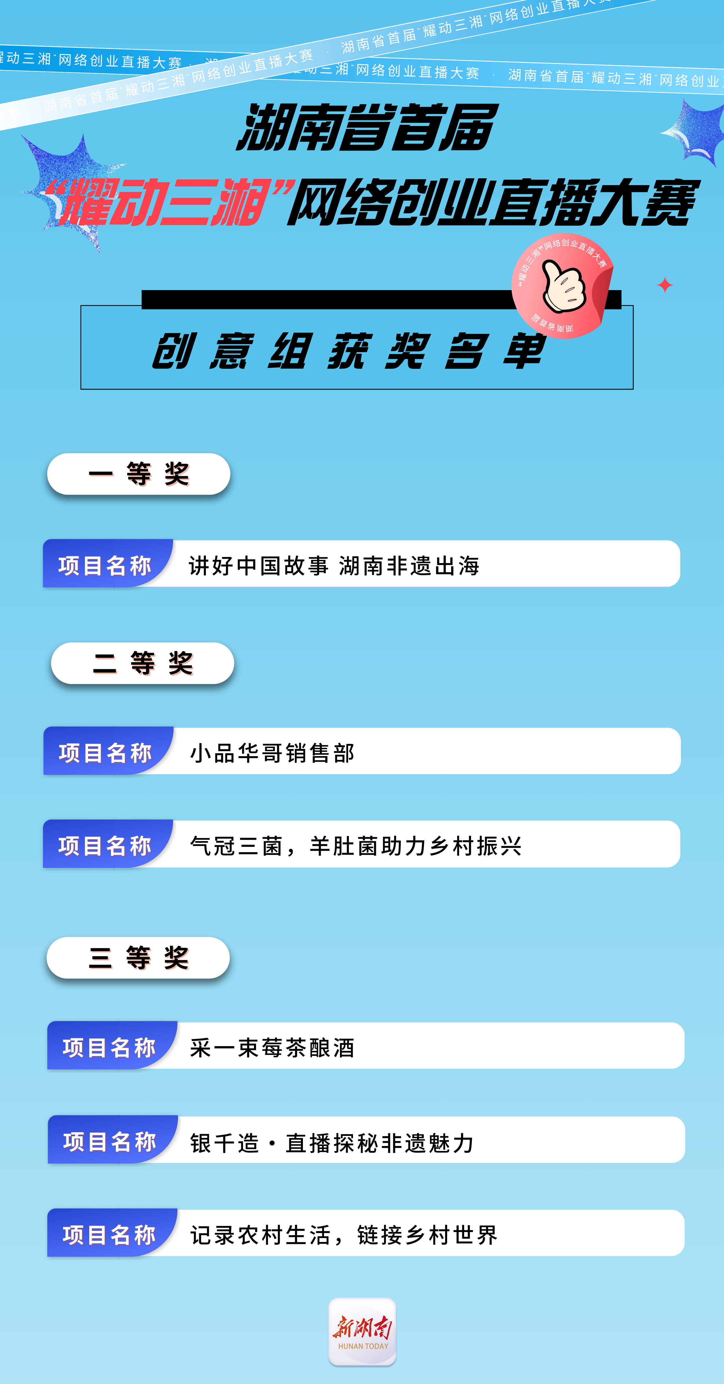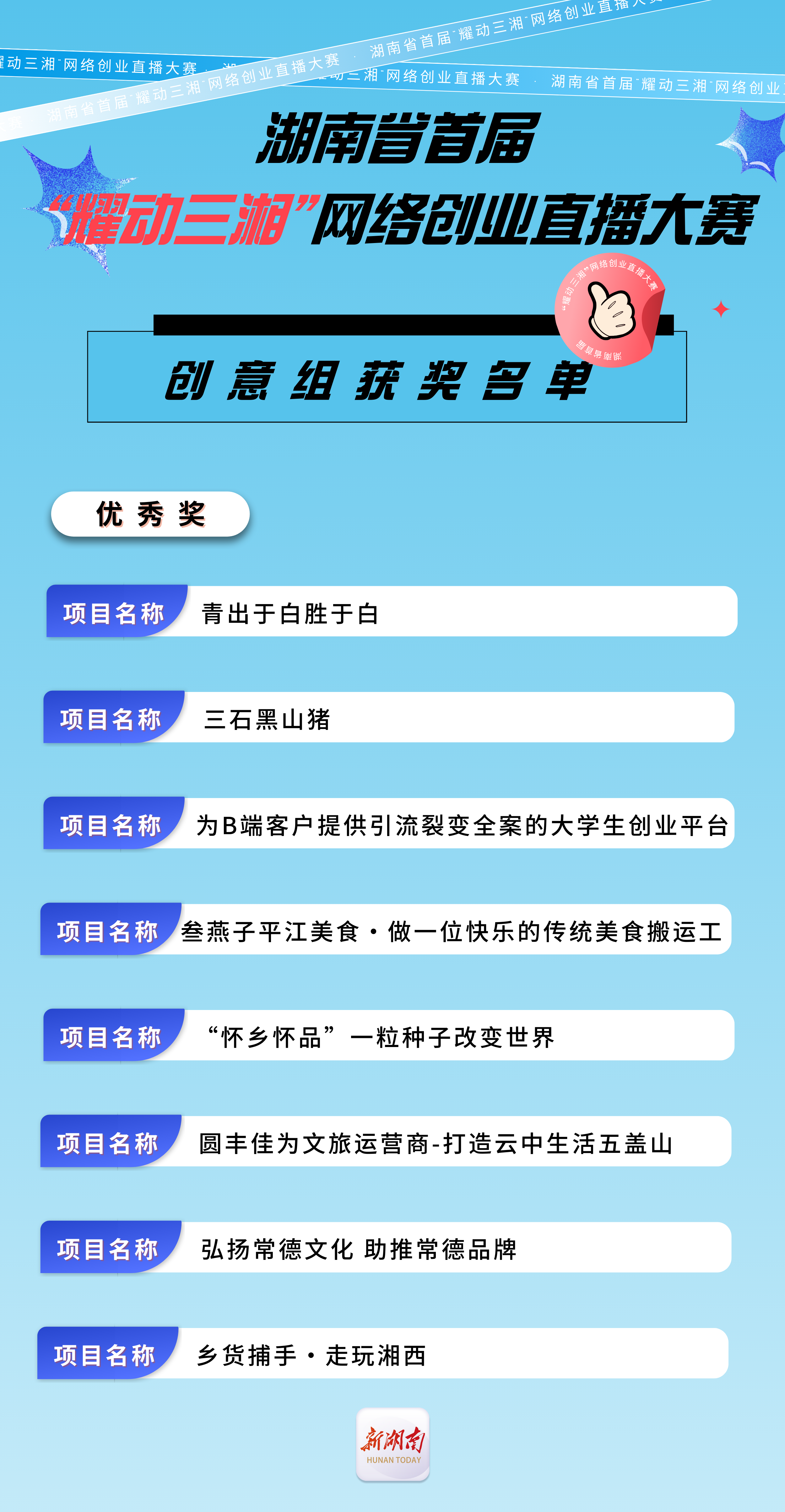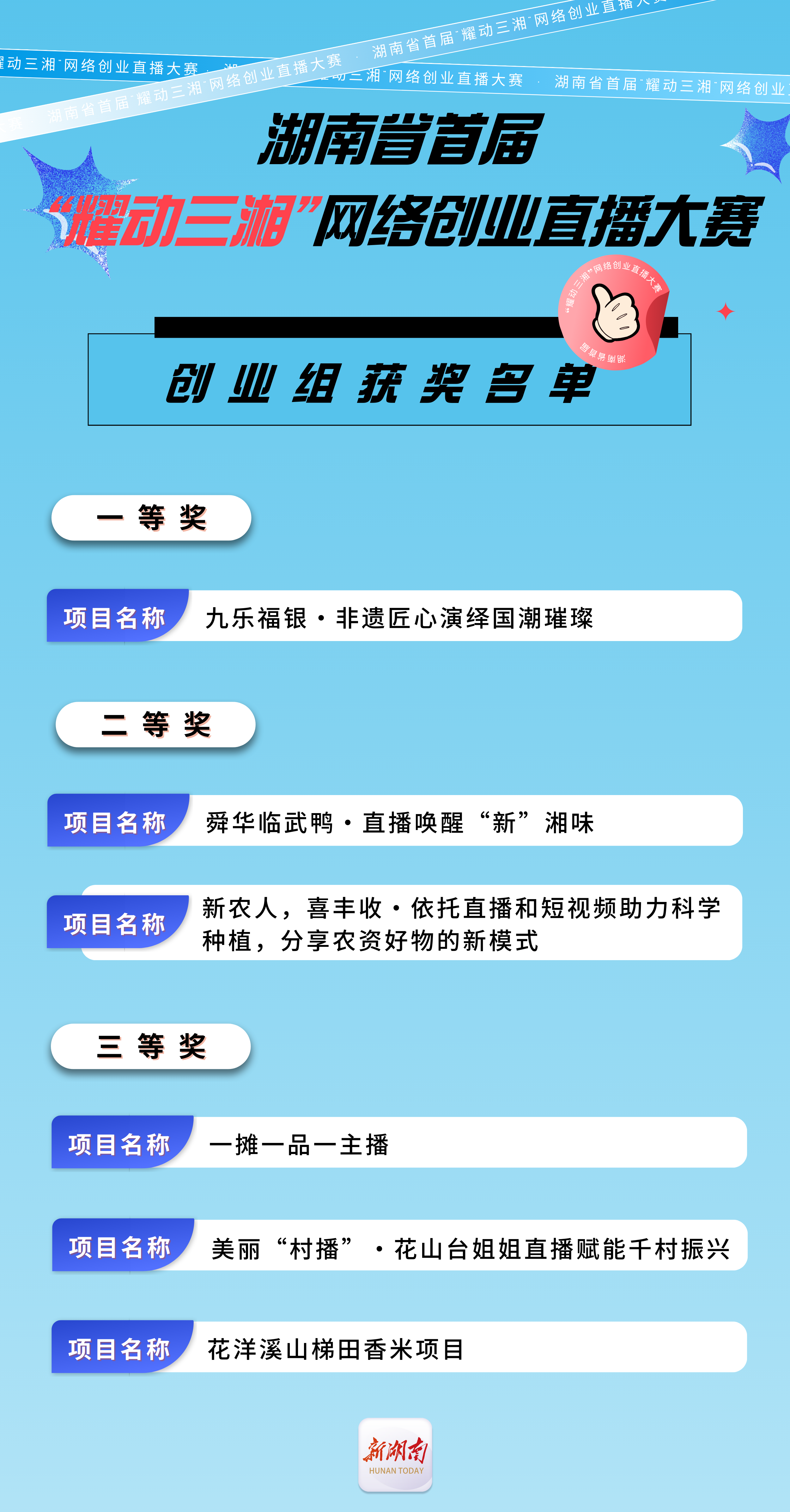 12月19日,我省首届“耀动三湘”网络创业直播大赛落下帷幕,这是湖南首次以“直播+创业”的形式办赛,56个项目参与竞逐。12月20日,大赛颁奖仪式在长沙举行,28个项目脱颖而出,分获创业与创意2个组别的一二三等奖和优秀奖。