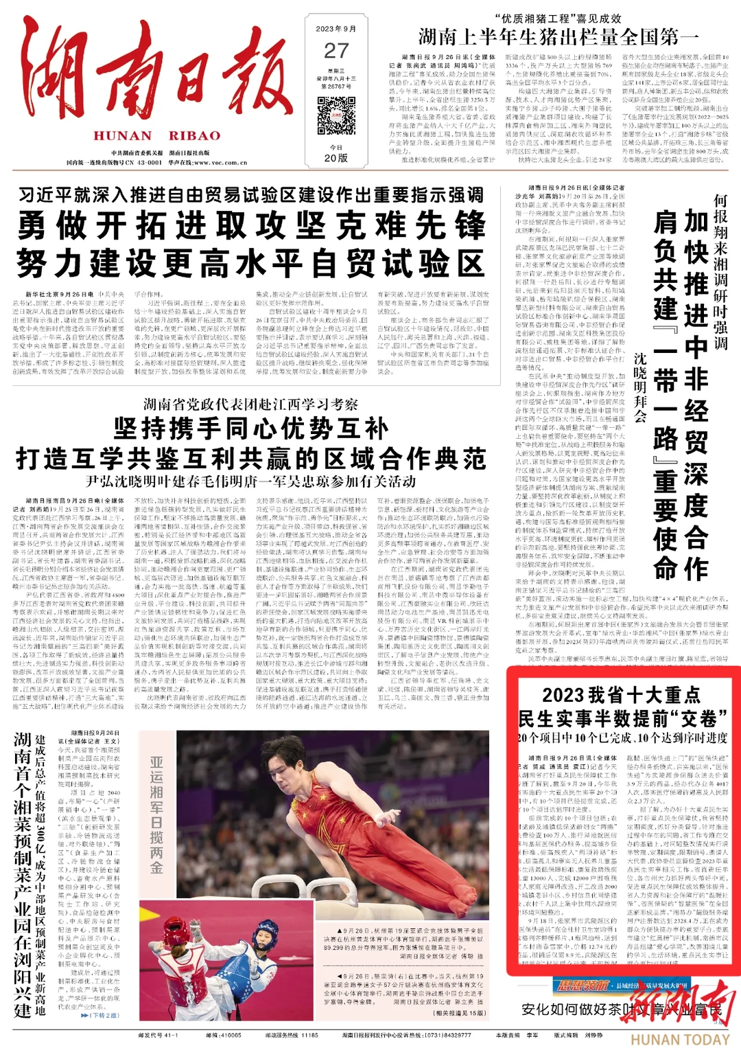 湖南日报9月26日讯(全媒体记者贺威通讯员袁江)记者今天从湖南省打好重点民生保障仗工作专班了解到,截至9月20日,今年我省实施的十大重点民生实事20个项目中,有10个项目已经提前完成,还有10个项目达到序时进度。